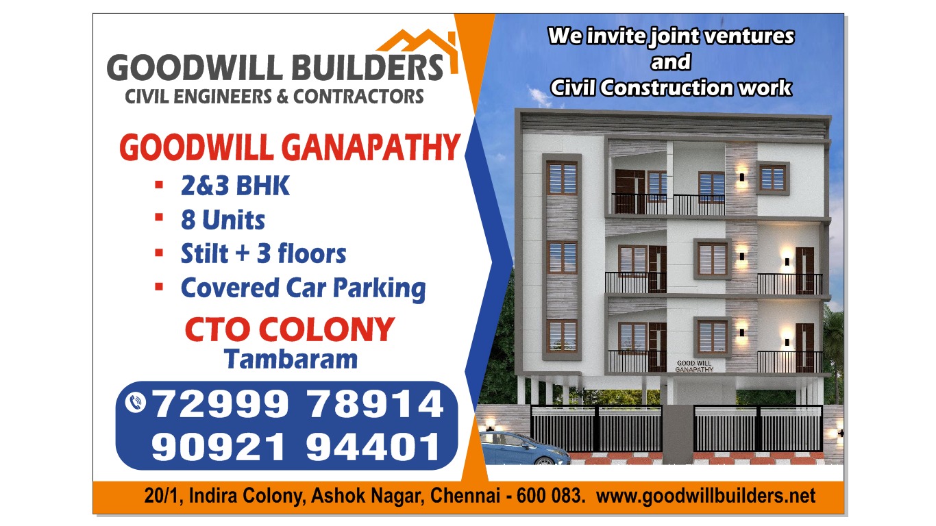 Goodwill Builders was established in the year of 1991 at Chennai by K.Srinivasan, a Civil Engineer with 19 years of experience on infrastructural related business. Goodwill Builders is a brain child of group of qualified, talented and experienced entrepreneurs driven by core values of integrity, commitment and loyalty to customers.